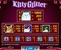 This IGT slot has a standard configuration, with 5 reels and 3 rows. There are 30 paylines, and you can select how many you wish to play with. As a cat themed slot, the feline symbols boast the highest payouts. The biggest wins are provided by the white cat. Line up 5 of these symbols on a payline to win 1000x your line bet. The next highest paying symbols are the Orange Tabby, the Calico and then the Siamese cat. The game also includes standard playing card symbols, A, K, Q, J and 10. The Kitty Glitter logo is the wild symbol. This substitutes for all others, with the exception of the bowl of diamonds scatter symbol. The scatter appears on reels 2, 3 and 4 only. Get 3 of these symbols and you will be rewarded with a payout of 3x your total bet.